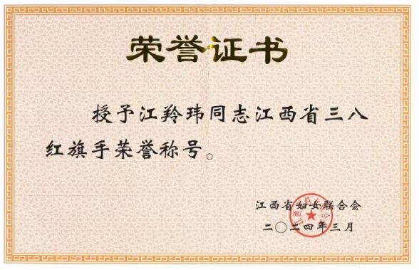 近日,集團員工江羚瑋榮獲江西省婦女聯(lián)合會授予的江西省“三八紅旗手”榮譽稱號。